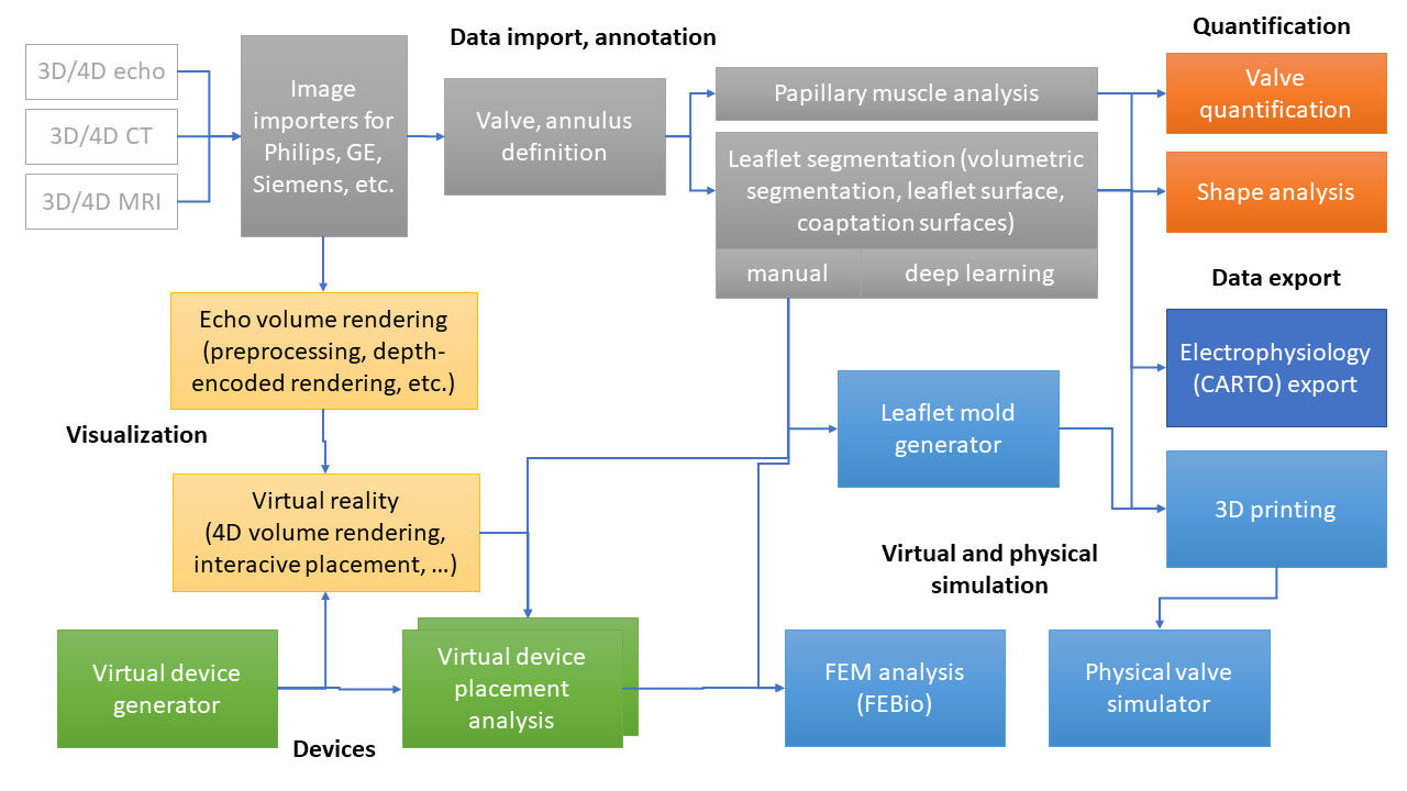 SlicerHeart extension contains tools for cardiac image import (3D/4D ultrasound, CT, MRI), quantification, and implant placement planning and assessment.